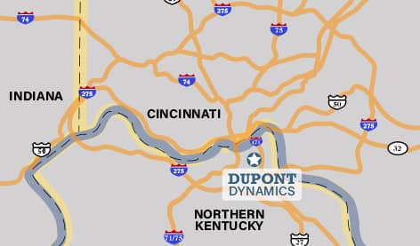 Dupont Dynamics is conveniently located 5 miles from Downtown Cincinnati in the Northern Kentucky corridor. We are inside the loop of major interstates such as I471, I275, I71/I75.