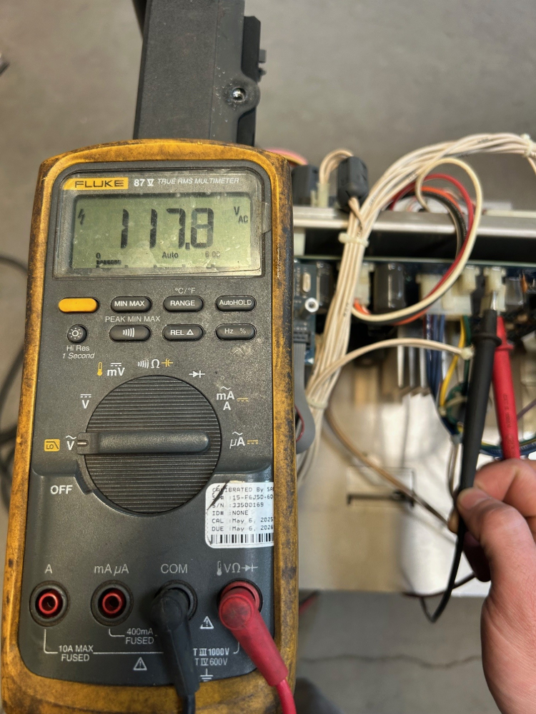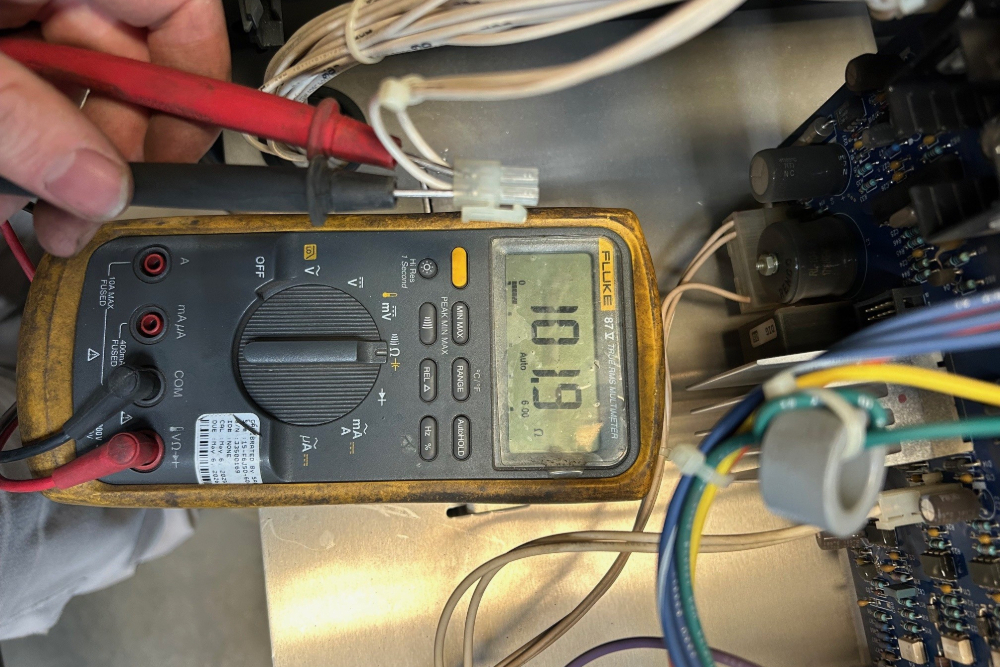 MILLER DYNASTY 400 TIGRUNNER The complaint unit is overheating. Strip metal blow out, while blowing off welder noticed the fan was not spinning, took front plastic cover off and fan blades would not spin. Dislodged the fan. Applied power to unit fan did not turn. unplugged and measured ohms and read open when it should be 100ohms. Verified that fan is getting power to operate. Weld tested and loadbank test pulled desired amps up to max output. Foot pedal does cause the front display to intermittently pop up ‘remote’ but it does not interfere with the weld output.